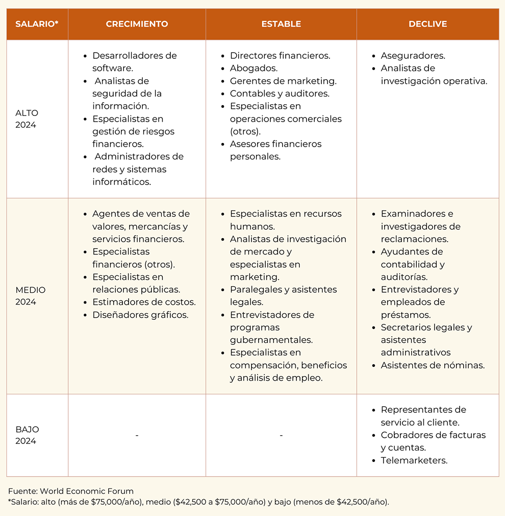 Los profesionales de TI se encuentran entre los roles de más rápido crecimiento, impulsados por la demanda de habilidades tecnológicas, especialmente en áreas como la ciberseguridad y la especialización en redes informáticas. Mientras tanto, los trabajos en gestión de riesgos también están en alza, especialmente en un contexto donde riesgos como el cambio climático, la confrontación geoeconómica y las amenazas a la ciberseguridad son prominentes.
