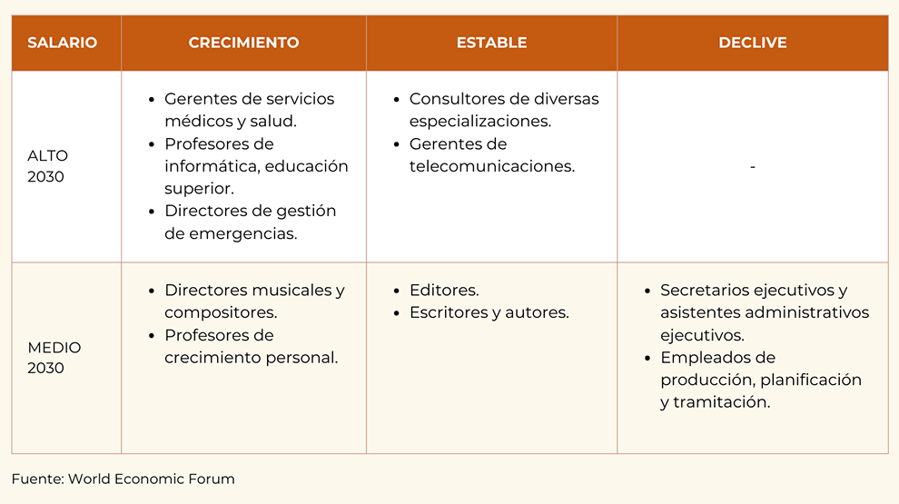 Se proyecta que, para 2030, el número de empleos digitales globales alcance los 92 millones, con un crecimiento aproximadamente del 25%. Sin embargo, este crecimiento estará sesgado hacia los puestos mejor remunerados. Se espera que los empleos más rutinarios y de menor salario disminuyan a medida que la automatización continúa avanzando. Por otro lado, los empleos digitales bien remunerados en campos como el desarrollo de software, la ciberseguridad y la gestión financiera experimentarán un crecimiento significativo. La siguente tabla establece los empleos que se espera que se sumen a la lista de empleos digitales globales en un futuro cercano.
